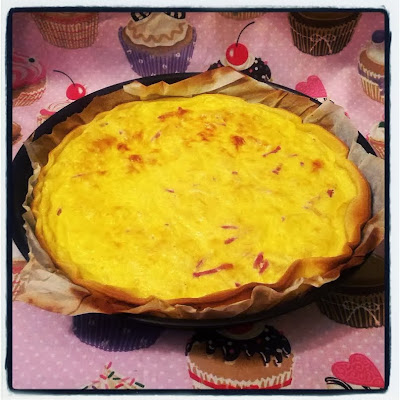 – Disposez le jambon et le gruyère sur la pâte, et versez le mélange crème, œufs, lait dessus.