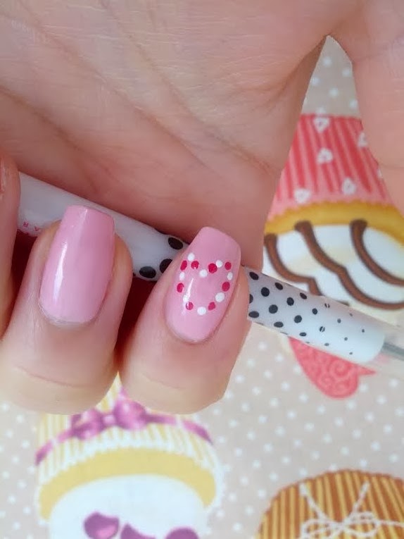 – Sur votre index, faites des petits pois blancs espacés en forme de coeur. Et complétez les espaces avec des petits pois rose foncés entre les pois blancs. ici, j’ai utilisé le côté petit pois du dotting tool Bourjois.