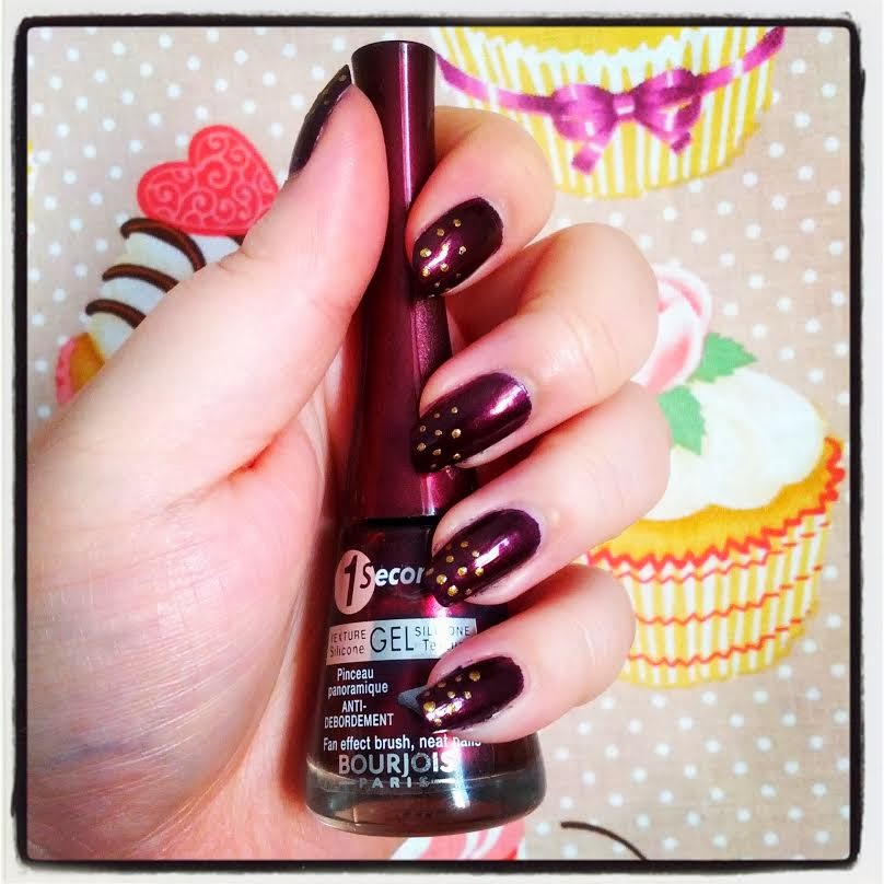 Ici, j’ai fait des petit pois que sur le bout des ongles un peu en biais de façon à ce que les pois soient alignés sur tous mes ongles.