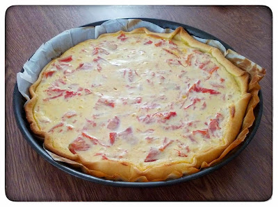 – Reprenez votre plat à tarte. Ajoutez le jambon à cette étape, sinon versez directement la préparation sur la pâte et enfournez 20 minutes à 200°C.