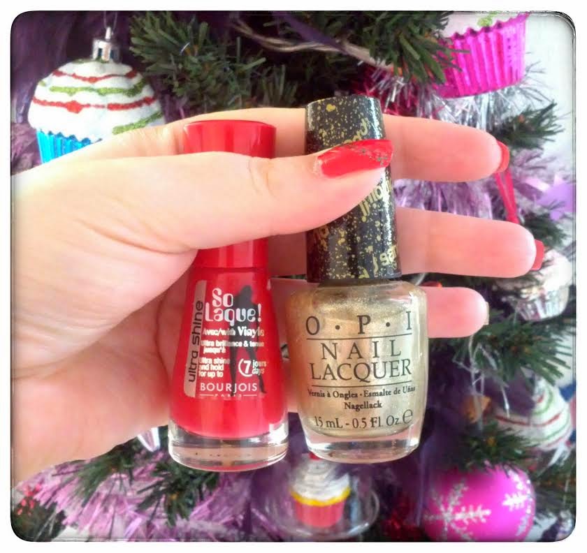 Pour réaliser ce nailart vous n’avez besoin que de trois vernis, un vernis rouge, un vernis or, et un vernis à paillettes. J’ai choisi le rouge fashionista de Bourjois, le liquid sand Honey rider de O.P.I. qui a un fini sablé, et le top coat Glitter bomb Midnight Mistletoe de Rimmel London.