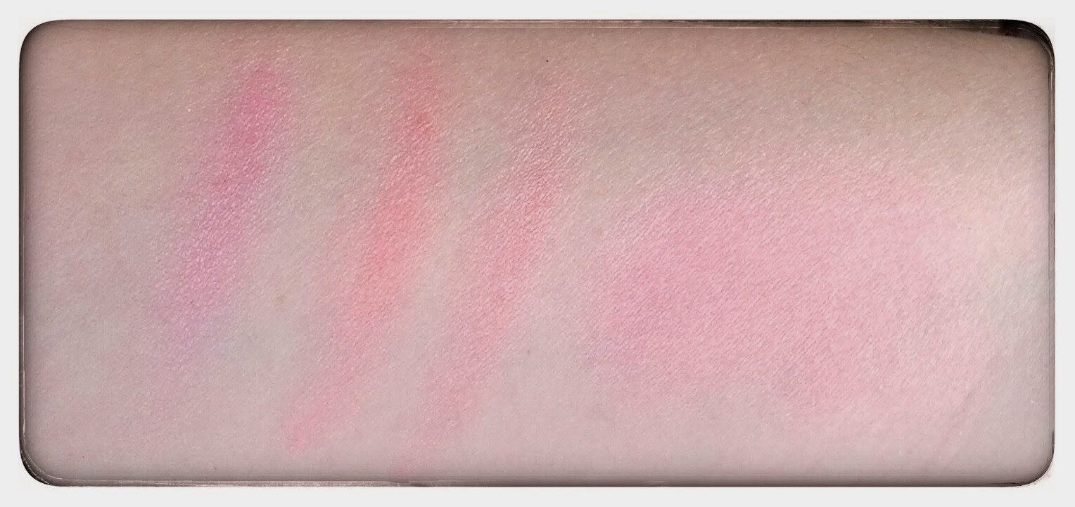 Comme je viens de vous le dire, il est composé de trois couleurs à utiliser ensemble ou séparément, les 3 teintes sont rosées, mais celle du milieu tire sur le corail. La pigmentation est bonne et les couleurs vraiment magnifiques. Je vous laisse admirer les swatchs, les couleurs sont par ordre de gauche à droite, et enfin ensemble.