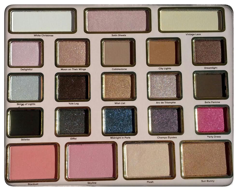 La palette est composĂ©e de 18 fards Ă paupières, dont 3 en grands formats, de deux blushs, d’un highlighter et d’un bronzer. C’est une palette en carton, avec une fermeture aimantĂ©e, personnellement je ne m’amuserais pas Ă la balader, mais je pense qu’elle tiendrait le choc. Comme pour toutes ces palettes, Too Faced l’accompagne d’un petit guide avec 4 idĂ©es de maquillages. Certains des fards ne sont pas inĂ©dit, pour ma part je ne possède qu’un double, le Satin Sheets, dĂ©jĂ prĂ©sent dans la Palette Boudoir Eyes, mais ça ne me gène pas, car je trouve ce fard très joli. Et je dois avouer que j’ai un rĂ©el coup de coeur pour le fard Arc de triomphe et le fard Champ ElysĂ©e.