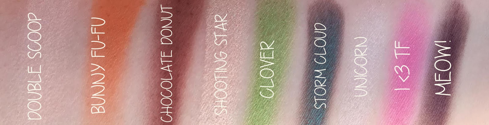 Ensuite, sur les fards, puisqu’au final c’est quand même ce qui nous intéresse, comme les autres palettes de ce format, la palette contient 9 fards, dont 3 en plus gros format. Le nom des fards est plutôt sympa, dont le vert au nom de Clover, le chien de Jerrod Blandino le créateur de la marque Too Faced. Mais on retrouve Chocolate Donut, ou encore Meow, ou Unicorn.