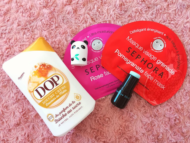Gel douche Brioche sucrée Dop Douceurs d’enfance 2.40€ en GMS – Masque tissu Sephora 3.95€ – Stick pour les yeux Panda Dream Stick 10.90€.