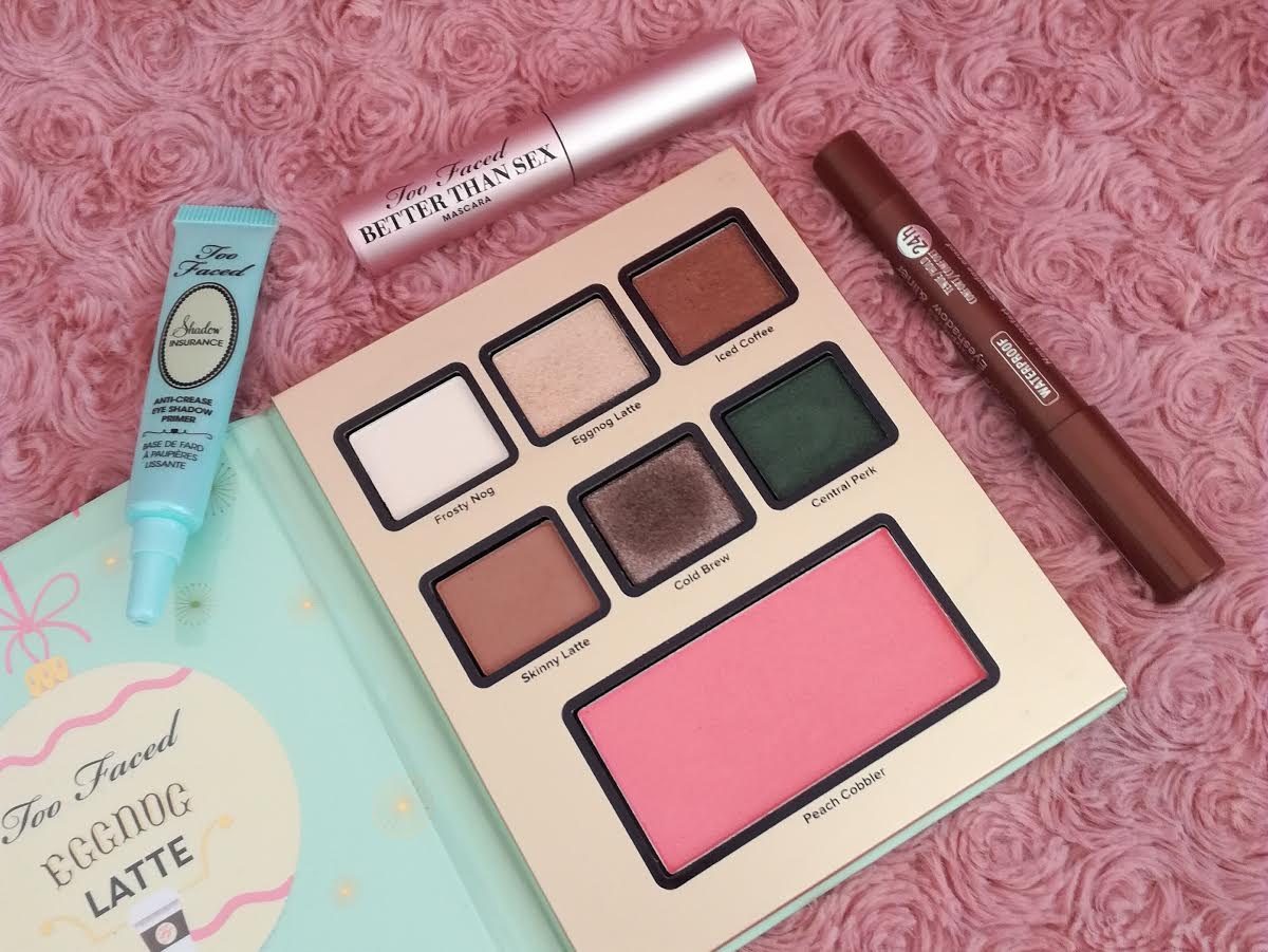 Il y a quelques temps, je vous parlais du coffret Grande Hotel Café de Too Faced, c’est donc tout naturellement que je me suis servi de celui-ci pour réaliser un make up festif. Je me sers exclusivement de la palette Eggnog Latte. Pour le teint, je ne l’ai pas spécifié car vous ne le voyez pas, sachez juste que j’ai utilisé le blush de la palette, mais j’aime aussi le rendu avec le blush Baby love de Too Faced également.