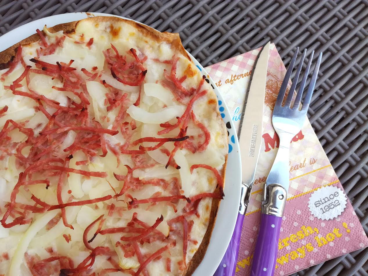 – Enfournez environ 10 minutes à 200°C, jusqu’à ce que la flammekueche prenne une jolie couleur dorée. Et dégustez bien chaud avec une petite salade, ou à partager à l’apéritif.