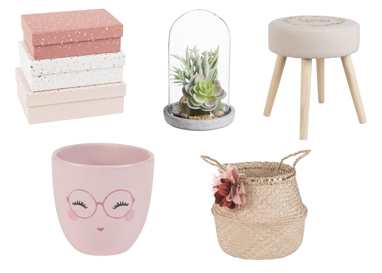 3 boîtes en carton tricolores imprimé doré 6.25€ au lieu de 8.97€ – Plantes grasses artificielles sous cloche en verre 16.45€ au lieu de 32.99€ – Tabouret rose clair et doré 19.95€ au lieu de 39.99€ – Cache-pot yeux en céramique rose H9 1.95€ au lieu de 3.99€ – Panier thaïlandais en fibre végétale à fleurs 12.45€ au lieu de 24.99€.