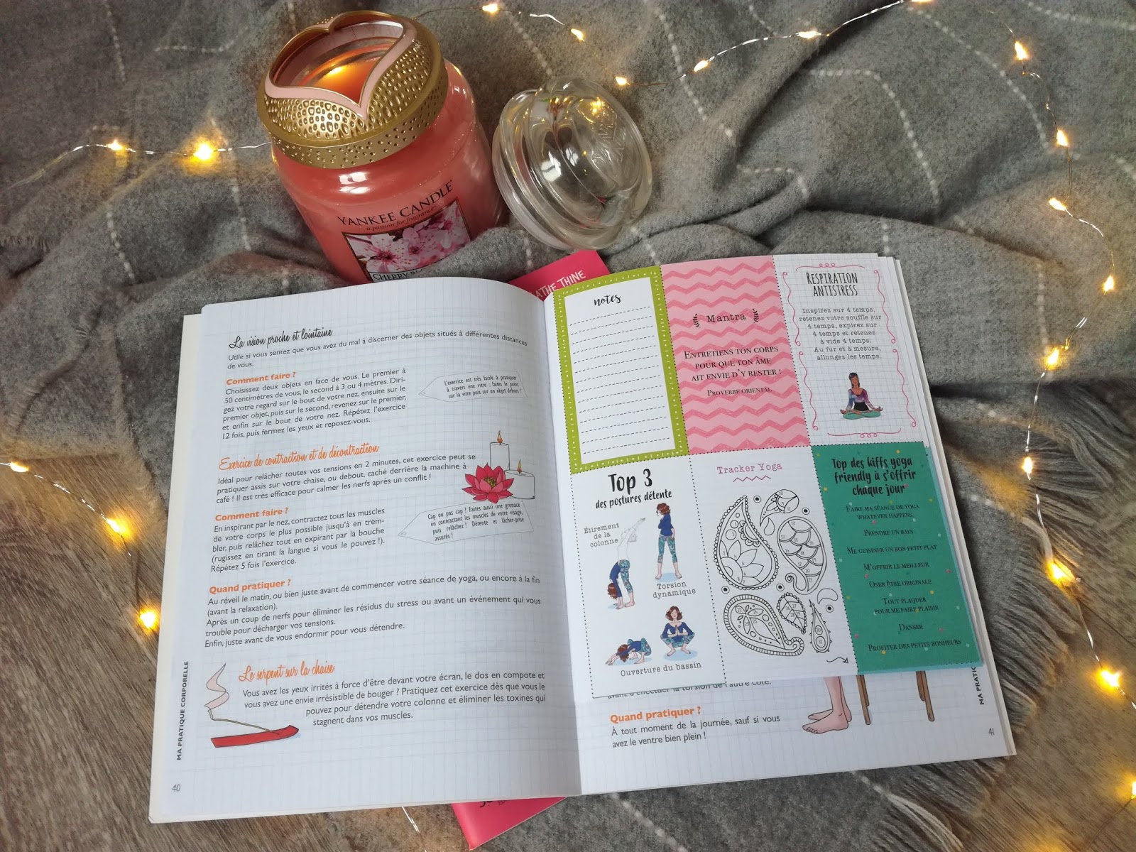 Je n’aime pas parler de résolutions, mais un de mes « objectifs » de l’année était d’apprendre à prendre du temps pour moi, pour me détendre. Je fais de l’hypertension et je suis une boule de nerfs, du coup j’ai eu envie de me mettre au yoga en douceur pour surtout prendre du temps pour moi et me détendre. Il y a de (nombreuses) années, je faisais de la danse, et notre professeur adorait le yoga et finissait souvent son cours comme ça, je connais donc quelques postures, mais j’avais envie d’avoir plus d’idées et de lire des livres sur le Yoga (oui quand on adore lire on veut toujours des livres sur tout non ? ^__^). Je me suis donc dirigée sur la collection « Mon cahier », car si vous me suivez depuis un moment, vous savez que j’adore cette collection, je vous ai d’ailleurs parlé de celui sur le Hygge et sur le Bullet journal