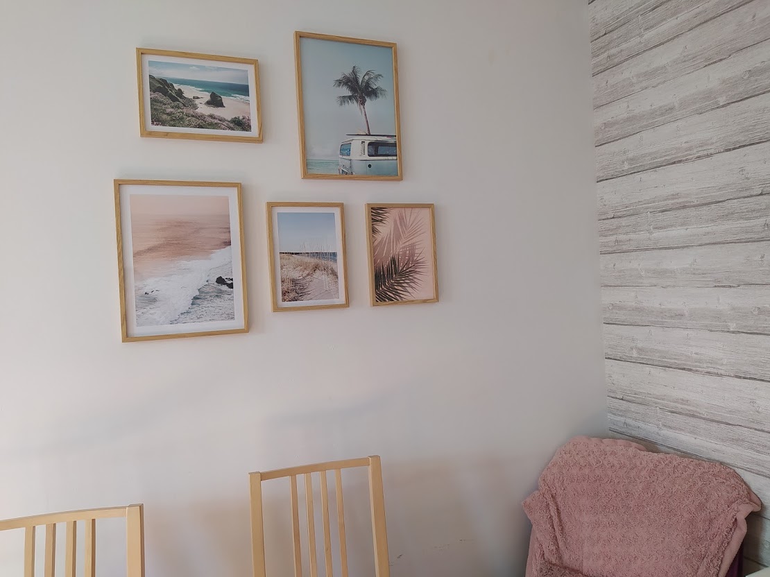 Nous on voulait le faire dans le salon mais on avait peur du résultat et finalement pas besoin d'une grande pièce pour que le rendu soit top, il faut juste choisir des cadres à la bonne dimension 🙂
